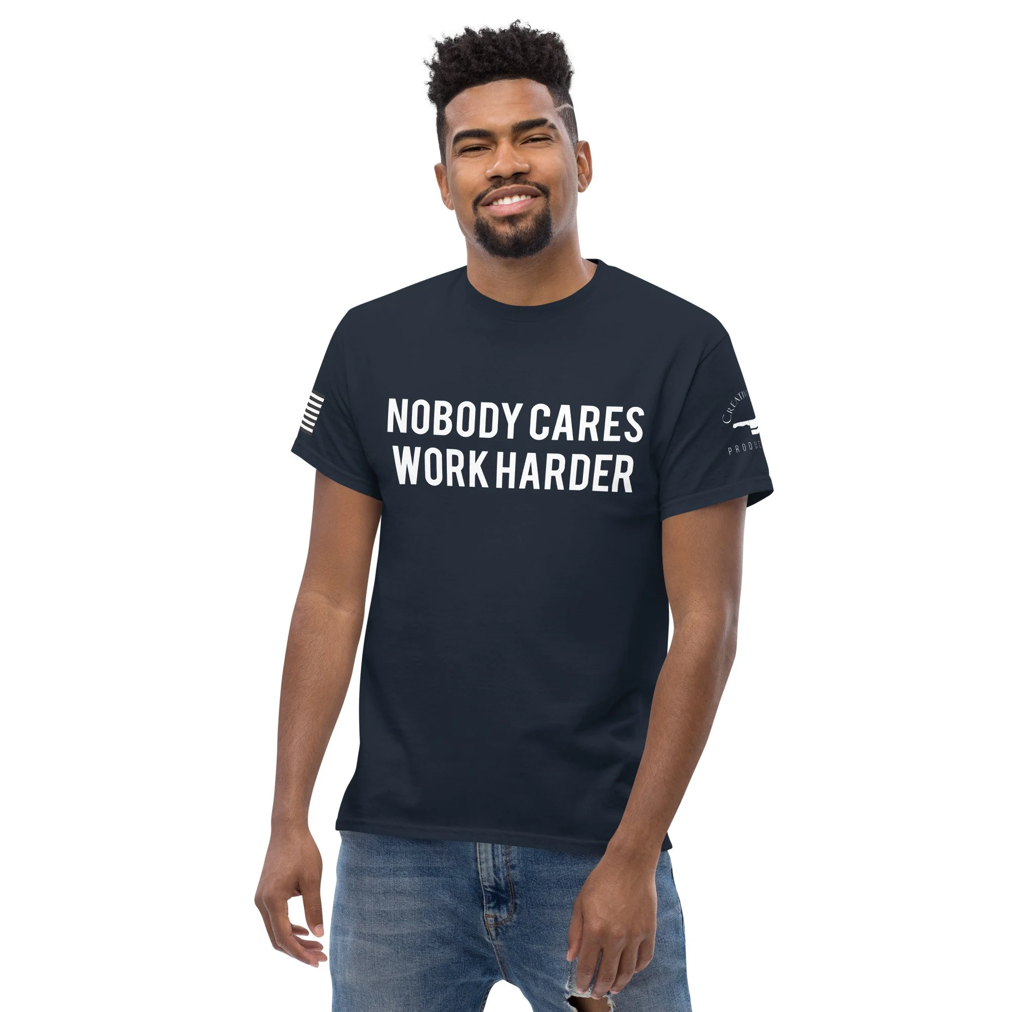 Nobody Cares, Work Harder Creative Guise Productions T Shirt White Logo. ( Eleven Colors Available)